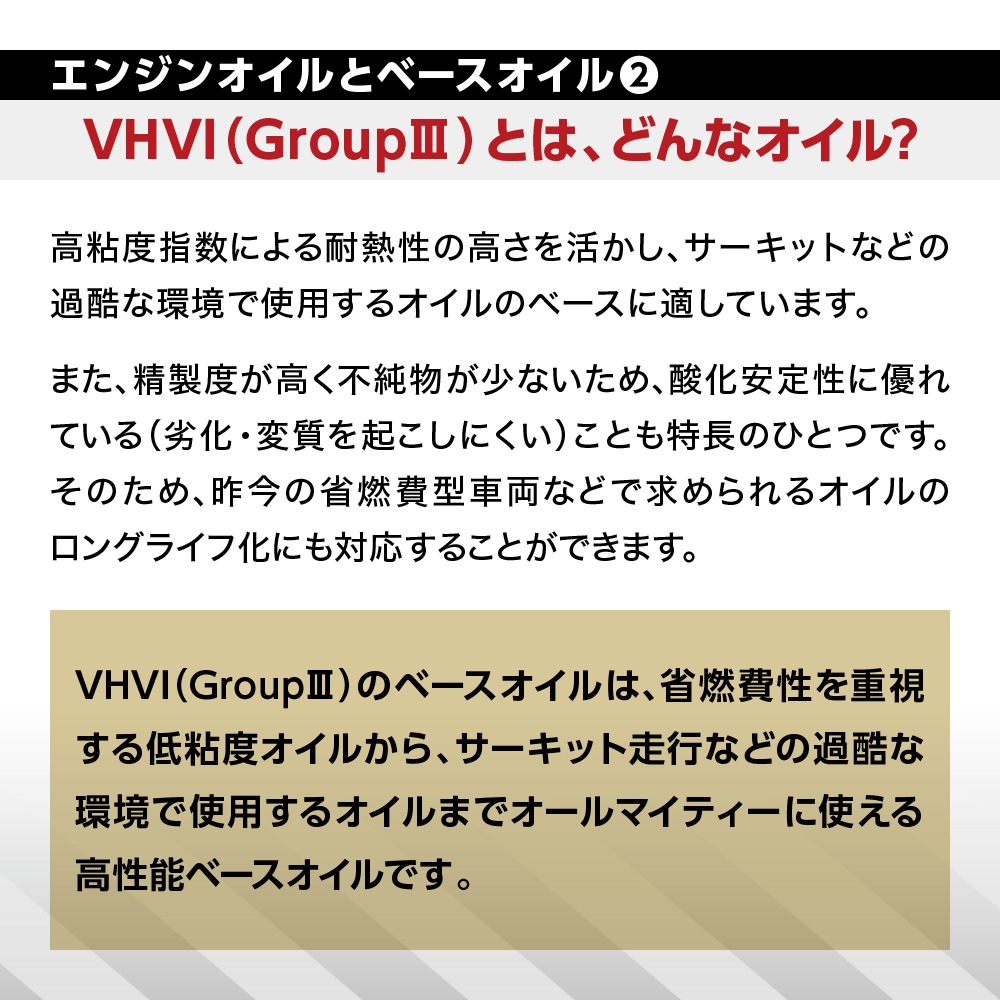 VHVI(グループIII)の化学合成油をベースに、各種添加剤を有効に配合しました。