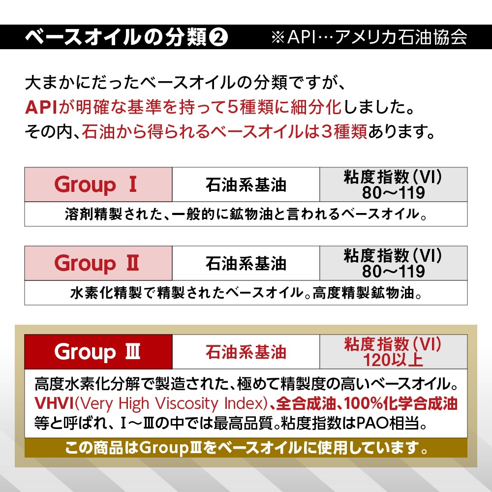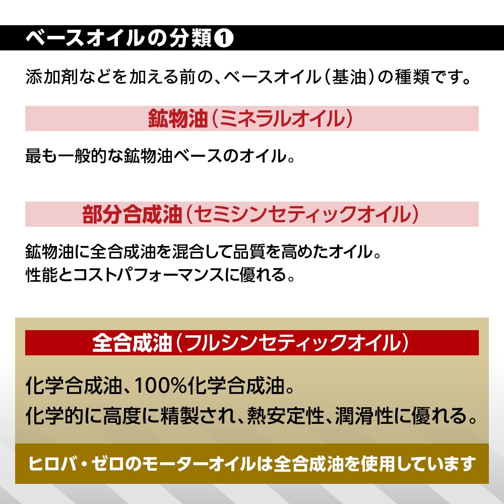 化学合成油をベースに、各種添加剤を有効に配合。高温下でのオイル劣化に強く、優れた潤滑性能を長期間発揮します。