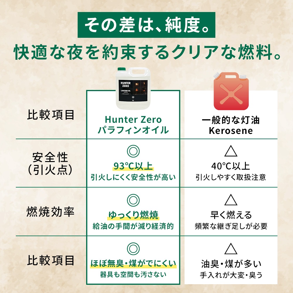 クリーンな燃焼: 高純度パラフィン系なので、気になる匂いやススが少なく室内でも安心。